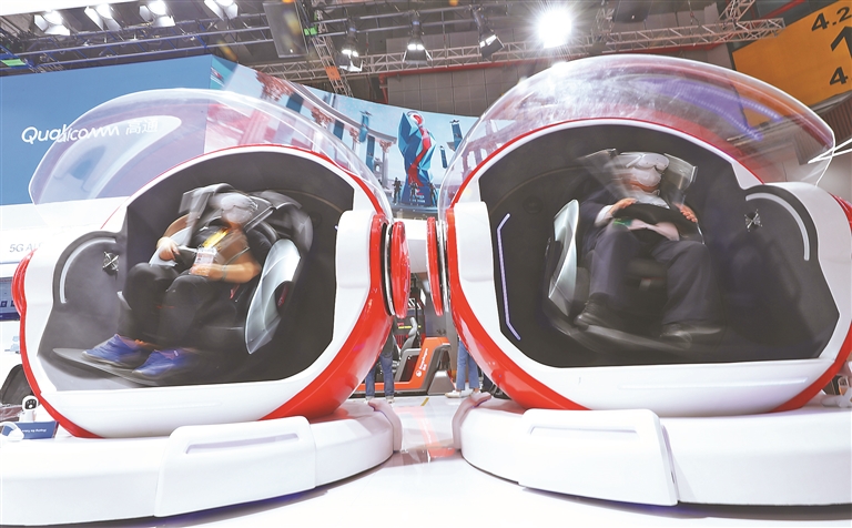 11月5日,参观者在第五届进博会技术装备展区体验一款VR游戏座椅。新华社记者 方喆摄