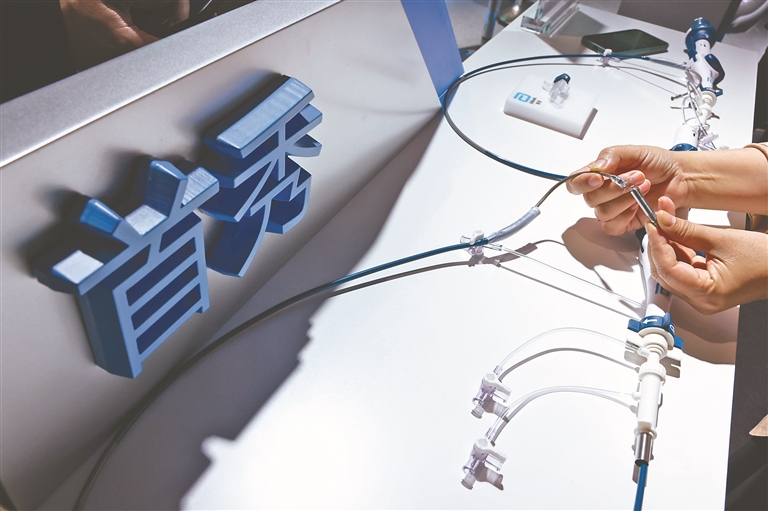 工作人员在演示一款无导线心脏起搏器。新华社记者 金立旺摄