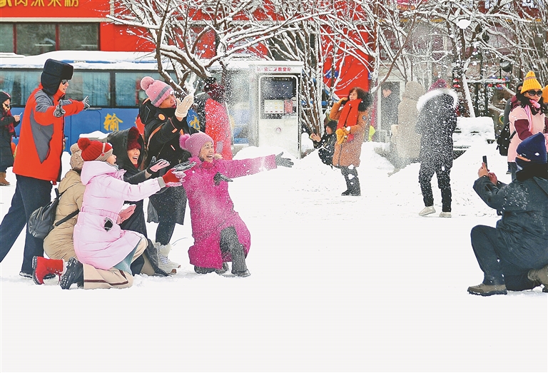 游人雪中嬉戏。本报记者 苏强摄
