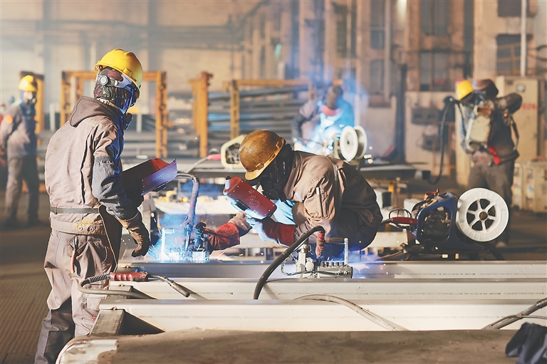 操作工人在C80B型敞车生产现场进行焊接作业。