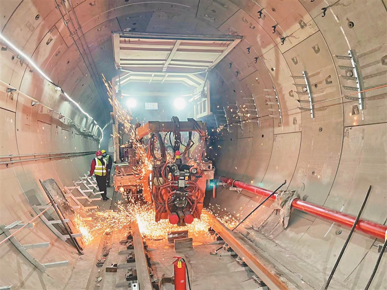 “地铁通车前需要将一节节短轨条焊接成专门供地铁车辆行驶的长轨道,也就是所说的‘长轨通’。”中交二公局哈尔滨地铁3号线GD-2标项目安全总监谢永刚告诉记者。本次“长轨通”共涉及5座车站,途经北马路站、靖宇五道街站、清真寺站、靖宇公园站、太平桥站,累计对650根钢轨进行无缝焊接,总长度7662米,形成贯穿始终的两根无缝轨道。本报记者 邢汉夫摄