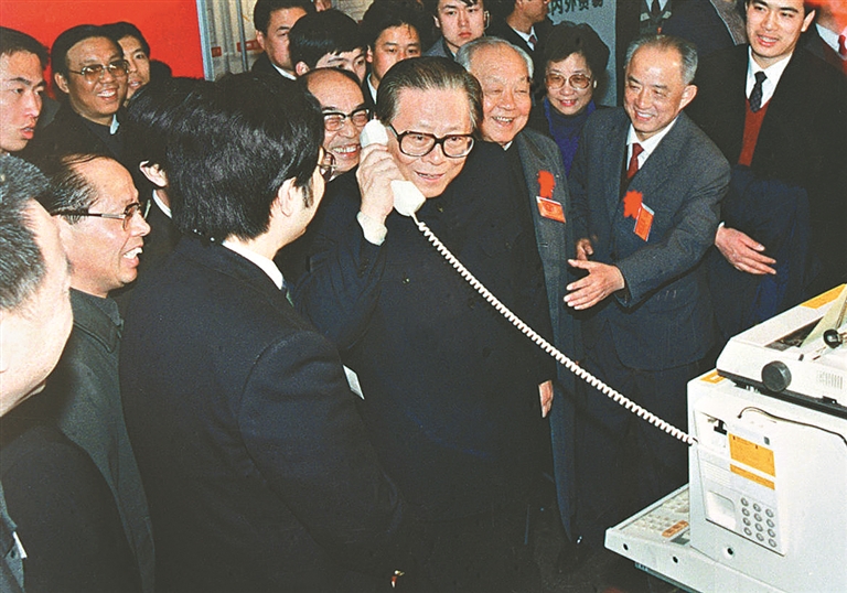 1984年5月,江泽民同志在北京展览馆举行的全国电子新产品展览会上,试用国际长途电话向远方的工作人员问候。新华社发