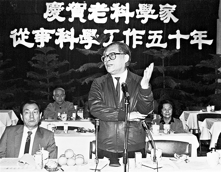 1988年10月,江泽民同志在上海庆贺老科学家从事科学工作五十年座谈会上讲话。新华社发