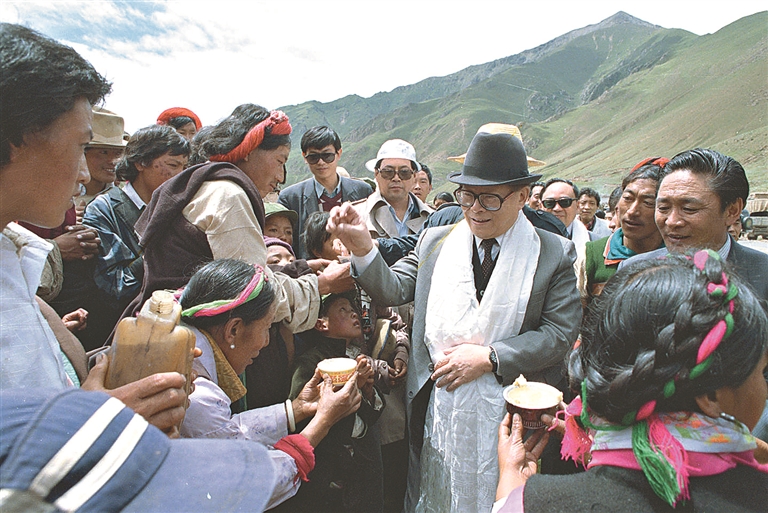 1990年7月25日,江泽民同志与藏族群众共庆望果节。 新华社发