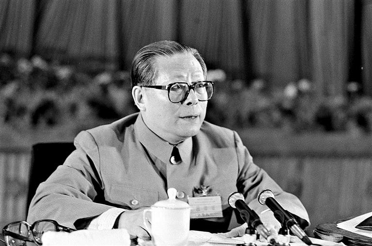 1989年6月23日至24日,中国共产党第十三届中央委员会第四次全体会议在北京召开。这是江泽民同志在会上讲话。新华社发