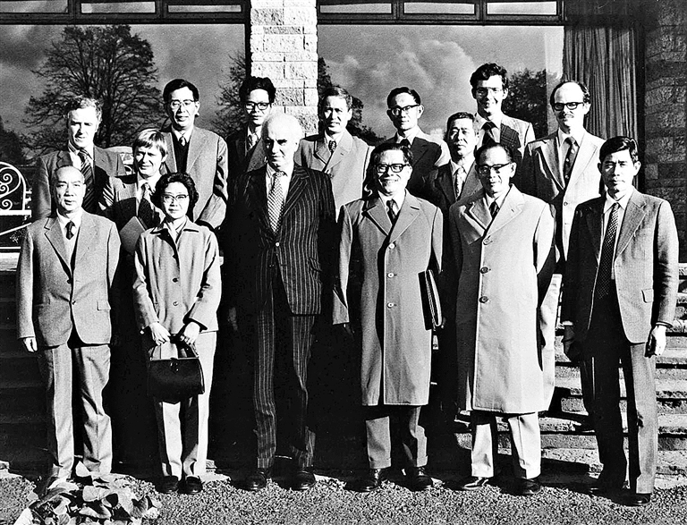 1980年10月底,江泽民同志(前排右三)在爱尔兰香农开发区考察时同开发区负责人等合影。 新华社发