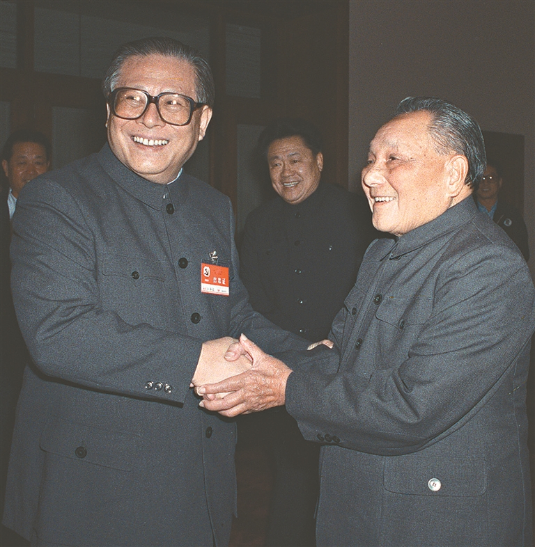 1989年11月6日至9日,中国共产党第十三届中央委员会第五次全体会议在北京召开。这是邓小平同志和江泽民同志亲切握手。新华社发