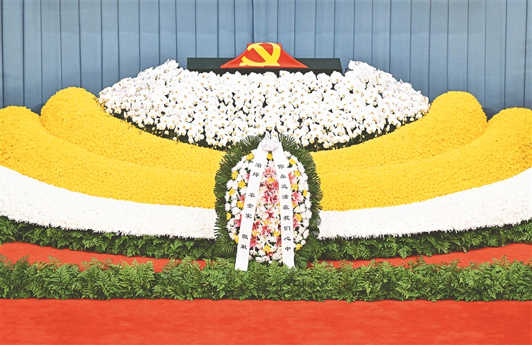 12月6日上午,中共中央、全国人大常委会、国务院、全国政协、中央军委在北京人民大会堂隆重举行江泽民同志追悼大会。 江泽民同志的骨灰盒安放在遗像前的鲜花翠柏丛中,骨灰盒上覆盖着鲜红的中国共产党党旗。江泽民同志的夫人王冶坪率全家敬献的花篮摆放在江泽民同志的骨灰盒前。 新华社记者 殷博古摄