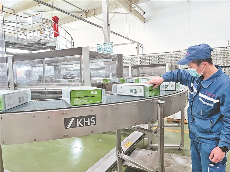在雪花啤酒包装车间,每小时产出12万听330毫升易拉罐啤酒的生产线正在高速运转。这是该公司2020年投资2亿元新上的生产线项目。据悉,近两年,该公司坚持高质量发展,不断增加高端酒产能,2021年又投资6500万元上了一条每小时生产4万瓶纯生啤酒的生产线项目,并于今年6月投产。目前公司高端酒产能达到25万千升。