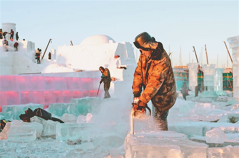 本报讯(记者刘艳)切冰面,拽冰排,松花江上采冰忙;油锯切,冰铲雕,“大世界”里建设欢。