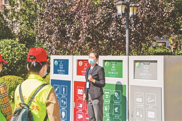 ⑥哈市一小区内,垃圾分类引导员进行垃圾分类。