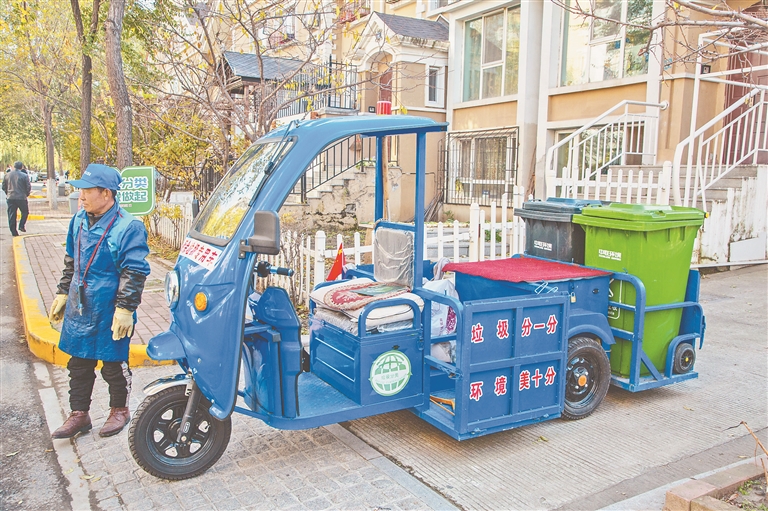 ②哈市一小区垃圾分类专用车。