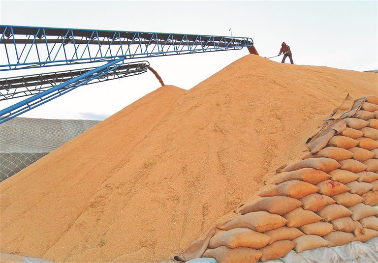 丰收的粮食堆积如山。