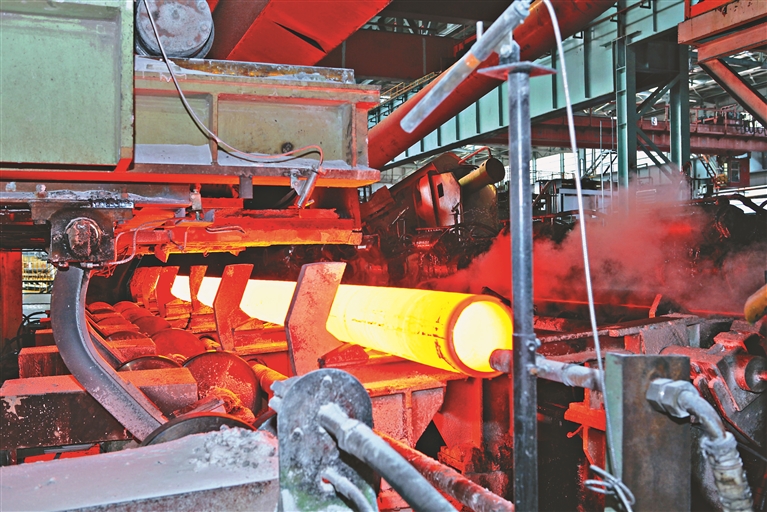 180无缝钢管生产线上,一根根火红的圆坯鱼贯而出。