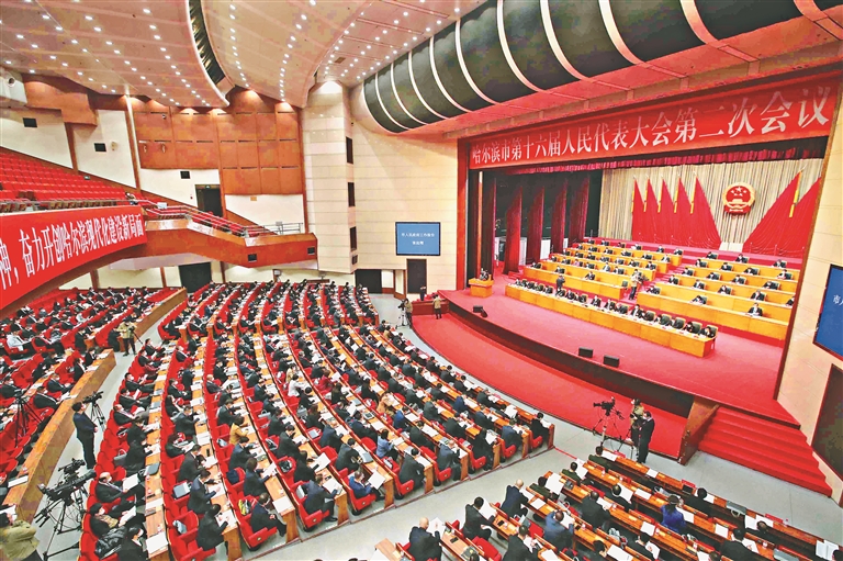 1月5日上午8时30分,哈尔滨市第十六届人民代表大会第二次会议在哈尔滨国际会议中心环球剧场隆重开幕。哈尔滨市市长张起翔在会上作政府工作报告。韩伟 摄