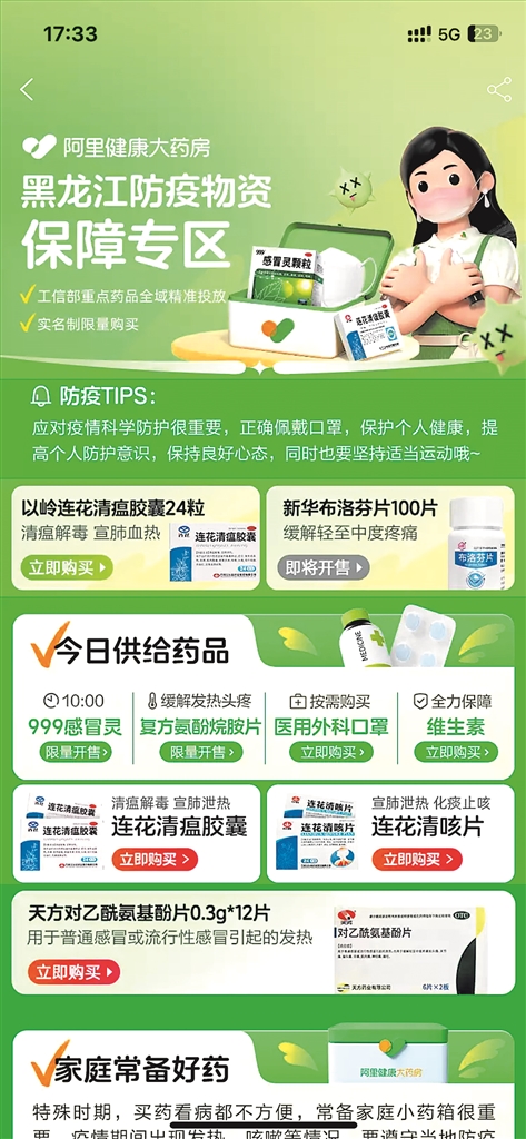 “黑龙江防疫物资保障专区”是为了做好新阶段疫情防控医疗物资生产保供工作,让更多急需药品的人有药可用,在国家工信部的支持指导下,黑龙江省借鉴国内相关省份经验,积极对接电商平台探索线上药品精准快速投放模式,推动阿里健康承建“黑龙江省购药保障平台”,建立国家统筹调拨药品及我省保供药品精准投放专属通道,全力保障黑龙江地区居民的购药需求,帮助群众快速获得所需防疫药品和物资。