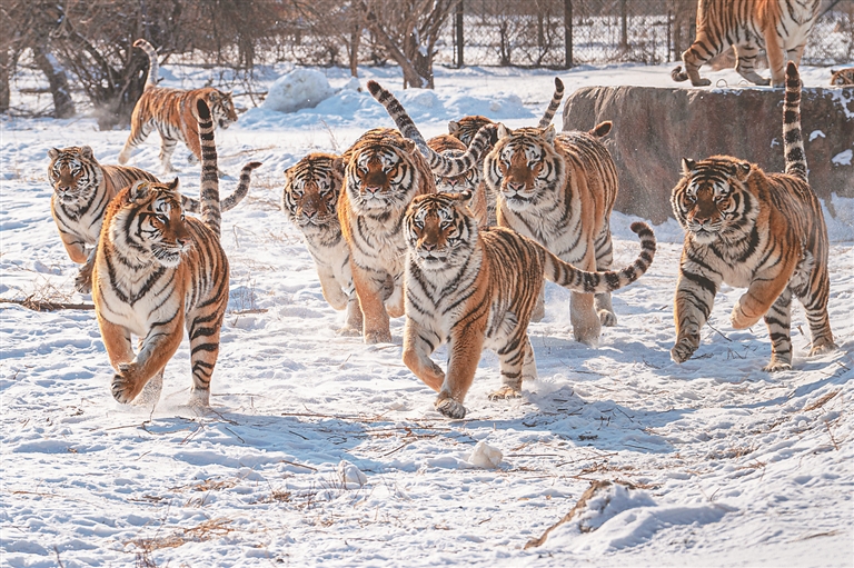 随着漫天雪花纷纷落下,又到了东北虎最爱的季节。黑龙江东北虎林园内,体格强壮、皮毛厚实的东北虎在雪地中撒欢打滚,尤为活泼。黑龙江东北虎林园饲养员张旭介绍:“冬季是东北虎的发情期,公虎们竞相展示着强壮的身姿,吸引母老虎的注意力,因而时常有老虎打斗的场面上演,非常震撼。”