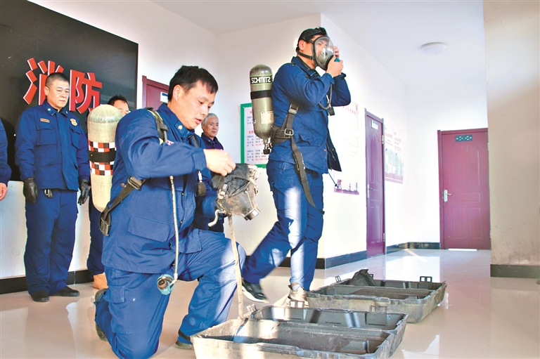 练习穿灭火防护服。