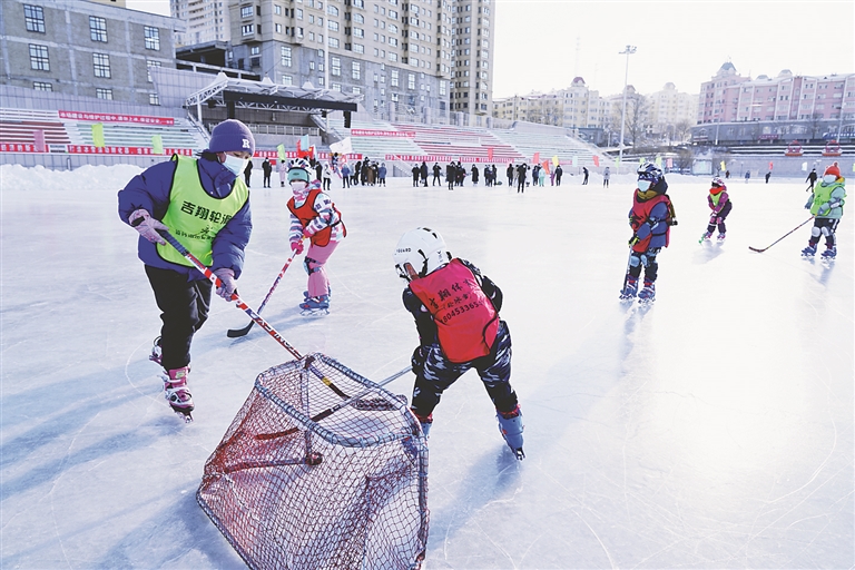 在中俄体育公园,8000平方米的滑冰场聚集了绥芬河市冰球运动爱好者和青少年速度滑冰爱好者,他们最小的6岁,最大的50多岁。在冰球运动展示活动中,头戴球盔、身披护具的孩子们斗志昂扬,踏上冰场的他们如同比赛的选手一样,来去如风穿梭自如,既帅又酷,团队配合对抗激烈。刚在对方球门前射门,一眨眼工夫,球已经到了另一方球门前。速度滑冰爱好者们你追我赶,激情享受这一北方冬天特有运动带来的乐趣。滑冰爱好者王瑞说:“我非常喜欢在冰上飞驰的感觉,我最喜欢冬天了,冬天会有冰场,大家可以在一起滑冰,一起交流,一起欢笑。”