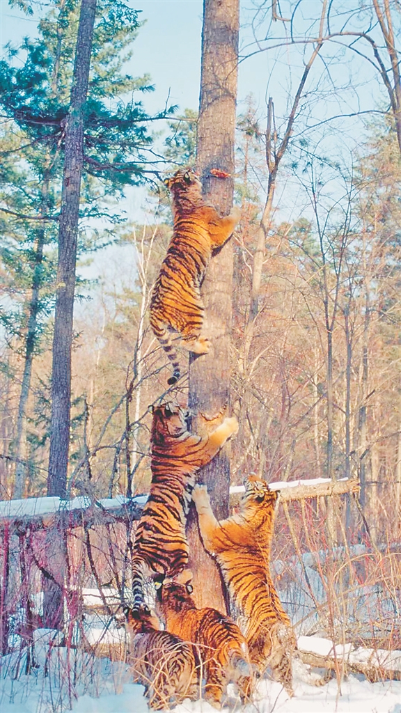 本报讯(见习记者唐海兵)新春假期临近,八方游客纷纷涌向冰城。黑龙江东北虎林园内,更是人声鼎沸,惊险观光车内时时传来游客的惊讶赞叹声。强健雄壮的东北虎于雪地间奔跑、跳跃、觅食、打闹,展示着丛林之王的霸气身姿。如果您远远瞧见有一大几小体型相差甚远的东北虎,不用怀疑,那正是虎妈妈带领着虎宝宝们悠闲散步呢!眼疾手快的幸运儿们,兴许还能捕捉到猛虎上树的精彩镜头哦!