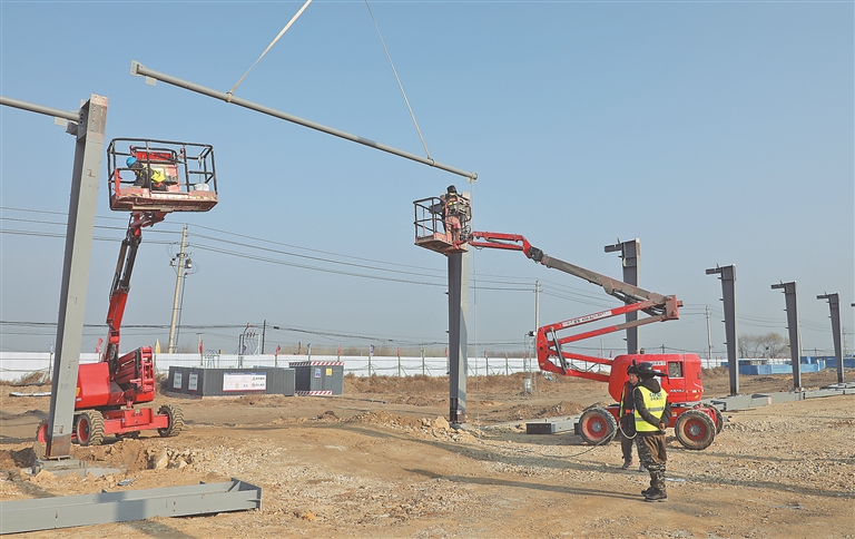 隆基绿能高效单晶组件项目正在进行成品库厂房钢结构安装。宋洋摄