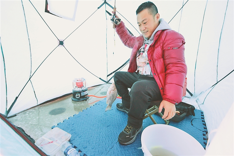 隆冬时节,冰雪盖地、鱼潜深水。近日,嘉荫县冰钓欢乐赛在嘉荫永安东湖开赛,吸引了省内外大批垂钓爱好者聚集于此。平静的冰面上,冰钓爱好者在帐篷里有条不紊地生起暖炉、凿开冰面、下好鱼饵,静等鱼钩跳动。冰钓爱好者以钓技论英雄,共享冰雪欢乐盛宴。嘉荫县将活动举办地设在永安东湖,这里北临界江黑龙江,与俄罗斯隔江相望,属国家3A级旅游景区。湖内鱼类资源十分丰富,深受广大垂钓者喜爱。经过1天的激烈角逐,来自哈尔滨市的冰钓爱好者孙喜拔得头筹。