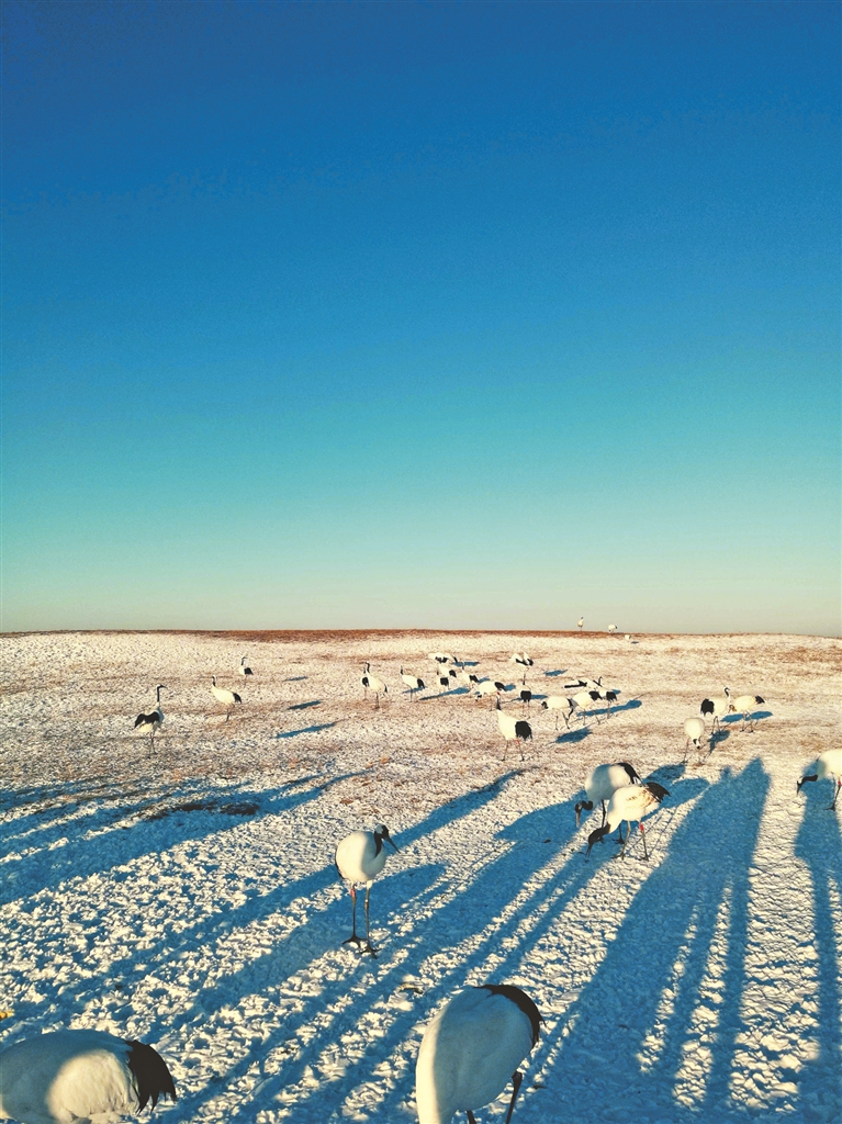 扎龙湿地内星罗棋布的泡泽被冰雪覆盖着,碧蓝的天映着洁白的雪,金黄的芦苇在寒风中摇曳着,不经意就会有十几只甚至数十只身着黑白羽衣的丹顶鹤在天地间翩然起舞。