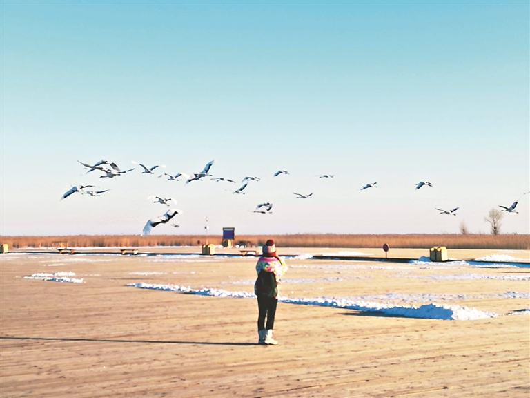 一眼望去,它们或一飞冲天,或在雪地上飘然起舞,或驻足高昂头颈仰天长鸣……它们自由自在地与自然和谐共生。仰望鹤,我仿佛自己也是一只高空展翅飞翔的丹顶鹤,与刘禹锡的“晴空一鹤排云上,便引诗情到碧霄”那种诗情画意融为一体,陶醉不已。