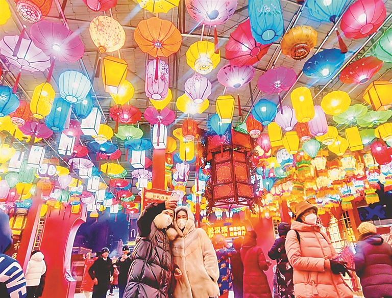 为迎接正月十五元宵节的到来,哈尔滨市各处张灯结彩,十分喜庆。1日,哈尔滨市道里区中央大街上,一家商场门前举行了迎元宵节赏灯猜谜活动,大红灯笼下悬挂了100多个谜语,吸引了许多市民和游客。江畔广场悬挂了许多造型各异花灯,成了人们打卡拍照的好去处。