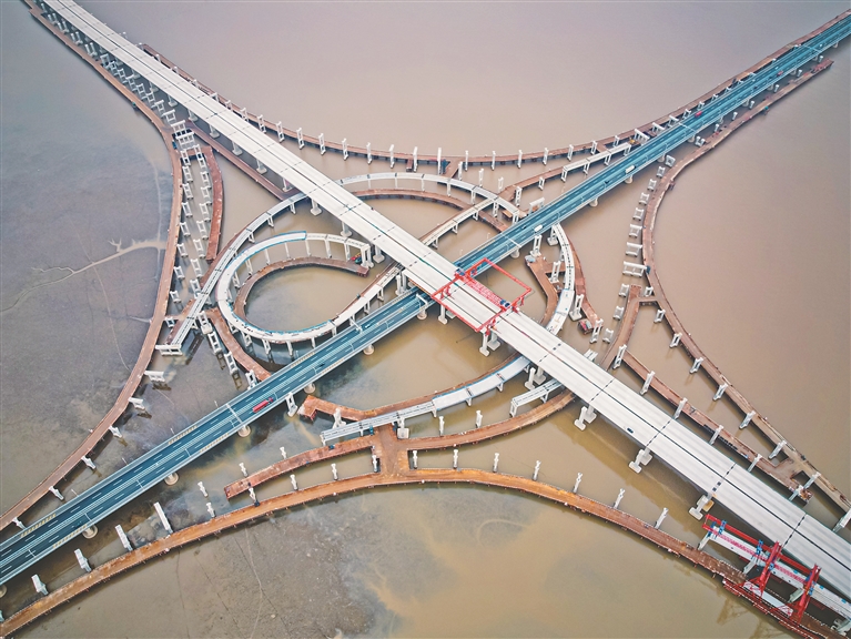这是2月1日拍摄的杭甬高速复线一期工程滨海互通(无人机照片)。