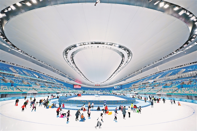 2023年1月30日,市民游客在国家速滑馆内滑冰,感受冰雪乐趣。