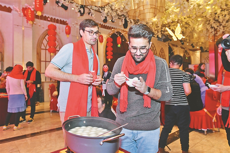 ⑤留学生品元宵美味。本报记者 郭俊峰摄