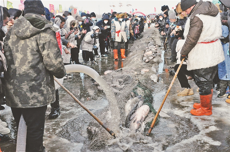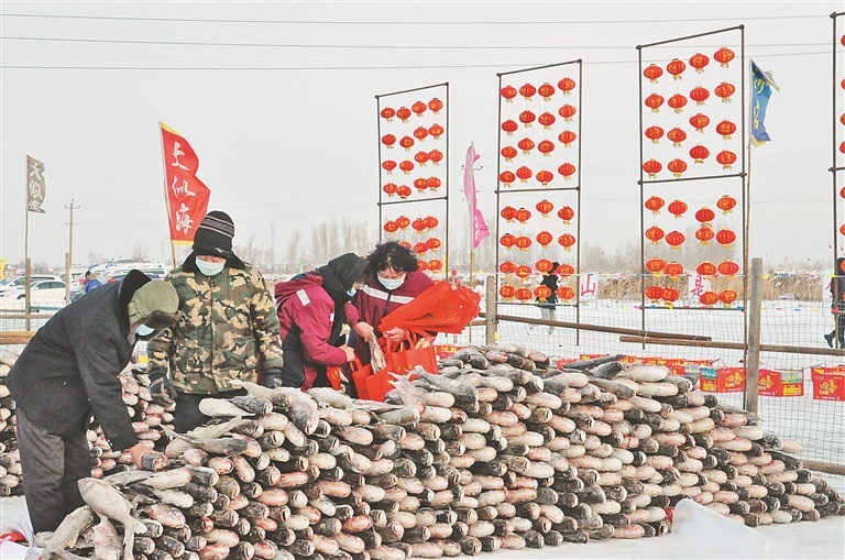 冬捕鱼的热销,渔民迎来丰收。“咱这里的冷水鱼经过一年四季觅食生长,冬天几乎不进食料,所以长得比较缓慢,脂肪又积攒得多,吃着口感好、营养丰富、肉质肥嫩鲜香。这网捕捞了1万多斤鱼,又是一个大丰收年。”肇东市涝洲镇大似海渔种场“鱼把头”孙海宽介绍。肇东市大似海鱼种场位于松花江北岸的涝洲镇新江村,水域面积3000亩,是国家绿色健康养殖示范区,以盛产鲤鱼、草鱼、鲫鱼、鲢鱼、鳙鱼为主。
