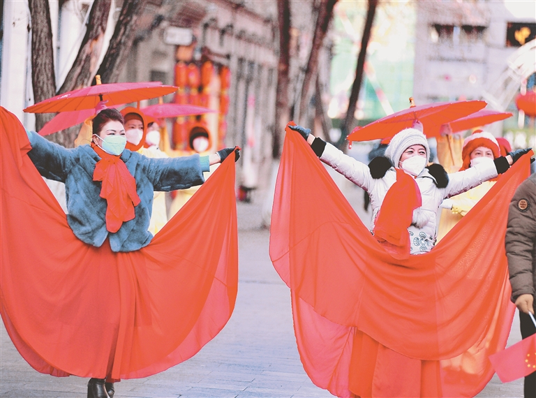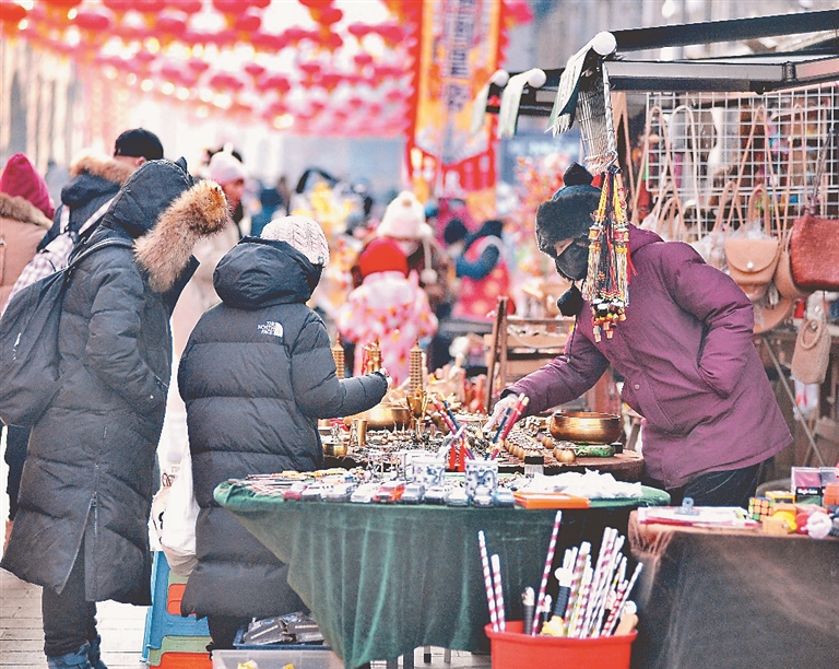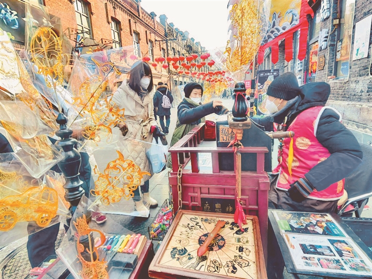 日前,哈尔滨市道外区巴洛克街区内,许多南方游客在参观游玩。道路两侧的百年老建筑受到游客们的关注,而设在街边的小摊也吸引了众人的目光。这些路边摊大都是沿街店铺经营者设置的,摊位上摆放的有木刀、铜壶、拨浪鼓等工艺品,也有冻梨、冻柿子、巧克力、冰糖葫芦等食品。游客们纷纷购买自己喜欢的小物件和食品。一位手工艺人现场制作糖画,吸引大家驻足观看、拍照,多位家长买来糖画送给孩子。一位文旅商品店铺的经营者说,现在正值旅游旺季,每天都有大量南方游客来到这儿逛街,把摊位摆在室外,方便游客选购商品,同时也可以为这条老街增加更多的艺术气息。