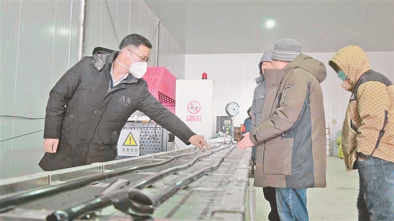 记者在现场看到,自动化生产机械先将粉色的贴片通过筛选输送进制造机,随后将管带原料烘干输送进制造机,经过现场技术员合理配比,不一会儿,制造机就运转起来,经过融化、压模成型、粘接贴片、冷却、打孔、盘管等程序,一盘盘滴灌管带就制造完成了。技术员告诉记者:“我们每天的生产量在43.2万米左右,趁着现在冬闲,多生产一些供应春耕备耕。”