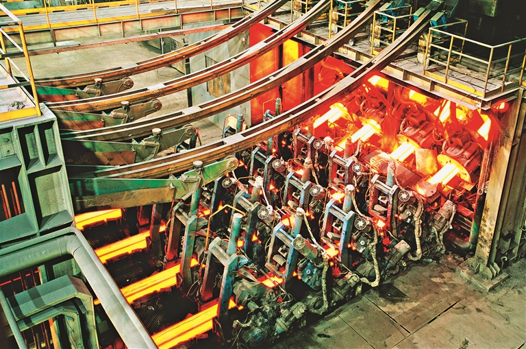 2月9日,在黑龙江建龙钢铁有限公司轧钢厂棒材生产现场,一派热火朝天的生产景象,生产线上的员工们正根据排产计划井然有序地操作着。一根根火红的钢坯从加热炉里鱼贯而出,在轧机的轰鸣声中轧制成为一根根合格的螺纹钢筋,由行车吊运至等待装载的货车上,运往全国各地的钢材市场。