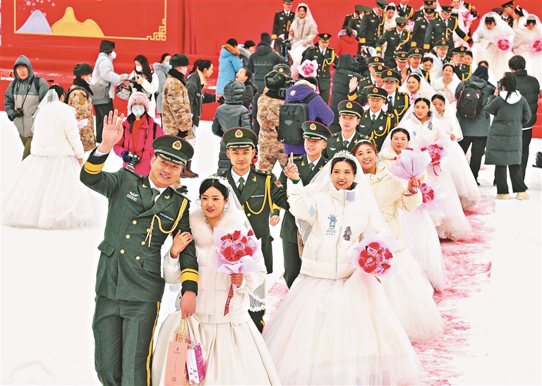11日9时58分,哈尔滨第三十九届冰雪集体婚礼在太阳岛雪博会举行。30对新人在嘉宾亲朋的共同见证下,许下爱的承诺。本报记者 刘艳 蒋国红摄