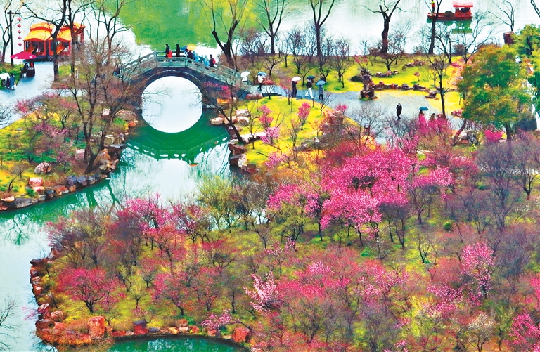 早春时节,南方各地春花开放、生机勃勃。10日,在江苏扬州瘦西湖风景区,游客在赏花游玩。 新华社发