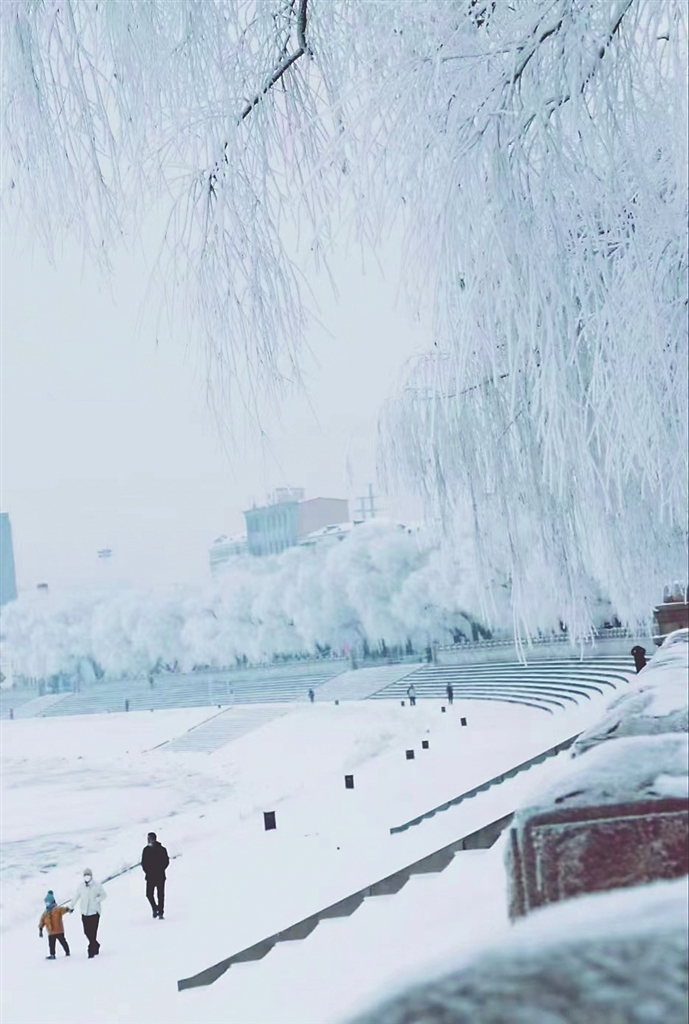 堤坝上,高大杨柳的树冠,一半婆娑向天,一半俏皮探向松花江面,状如黄山的迎客松。只是它不是松,也不是一棵独立,而是井然有序地排成排,连成片。枝条上挂满非雪非霜的银屑儿,如花如簪,如蝶如烟。原本冷寂的严冬因它的到来,顷刻间变得丰盈、生动且美妙。