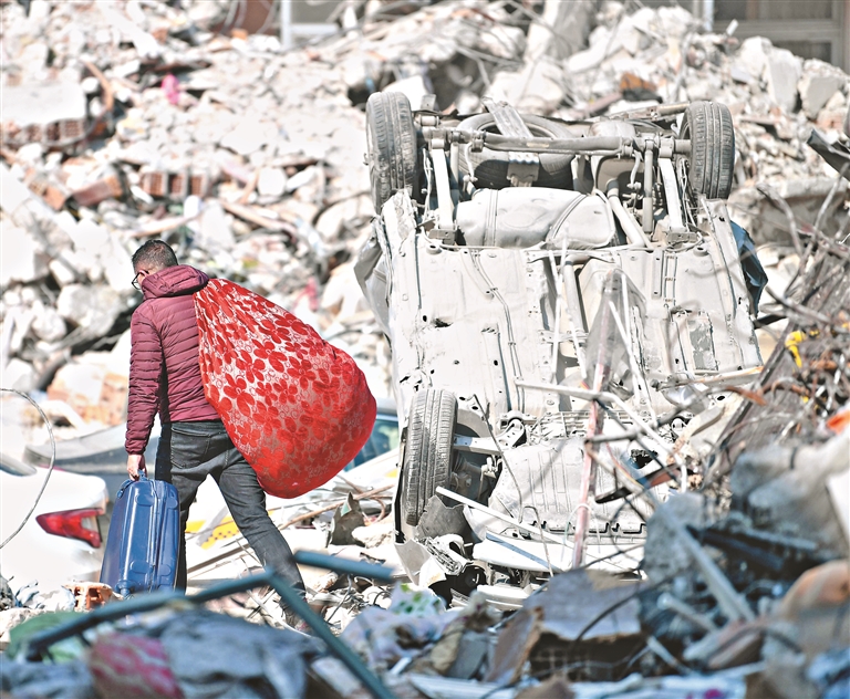 上图:2月11日,一名男子走在土耳其哈塔伊省安塔基亚市的地震废墟上。