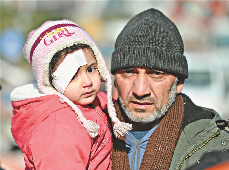 下图:2月11日,一名抱着孩子的男子走在土耳其哈塔伊省安塔基亚市街头。