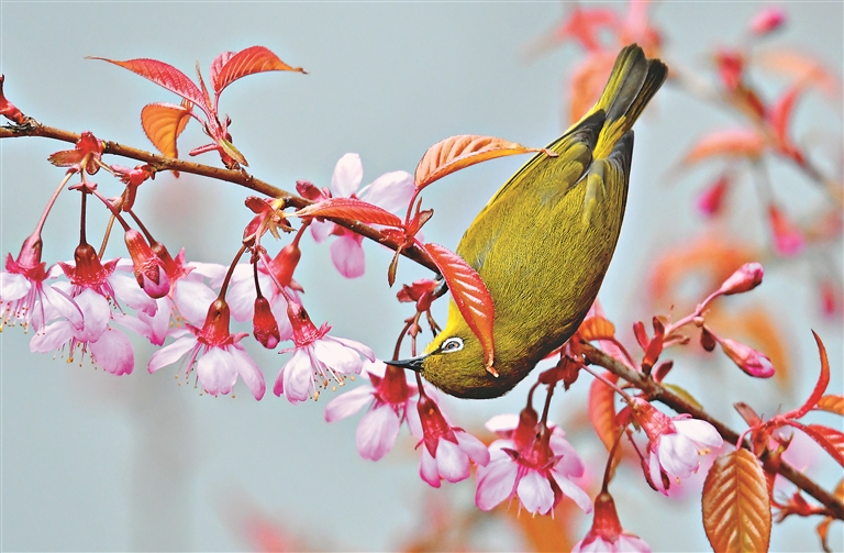 下图:绣眼鸟在贵州省贵阳市南明河畔水东路段的冬樱花树上穿梭于花枝间觅食啄花。