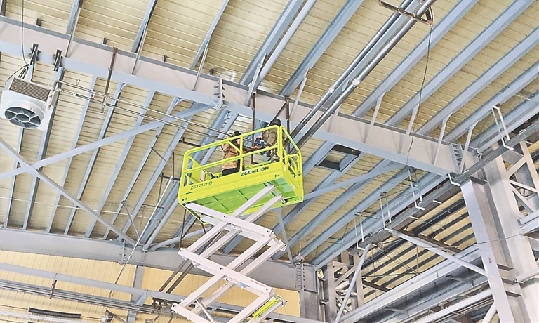 在车间内,工人手持切割机,将三角钢切成段,用成品制作管道支架;升降机缓缓上升,将工人升到棚顶位置,进行供暖阀门的安装;吊车将热风幕吊到大门两侧指定位置,工人进行支架焊接和安装,施工紧张有序……项目安全负责人田煜林介绍:“为了加快建设速度,项目正月初十就复工了。目前车间内各项工作进展迅速。”