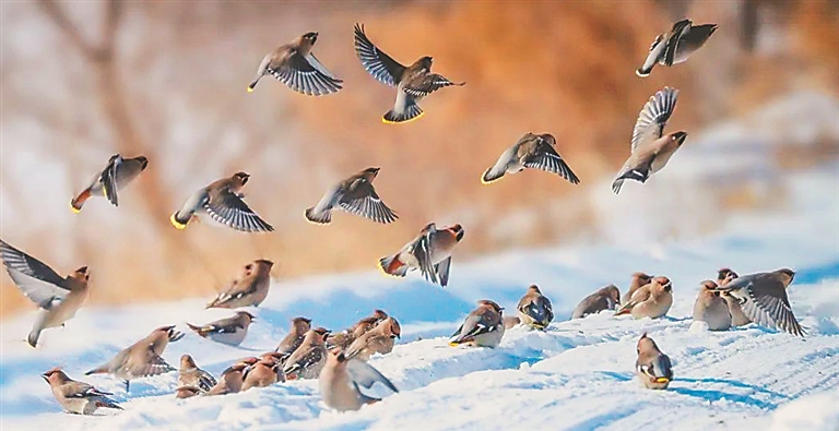 太平鸟为鸟纲太平鸟科的鸟类,属小型鸣禽,是国家二级保护动物。千只太平鸟云集宝清,形成一道亮丽的风景。头戴凤冠的太平鸟,为初春增添无限生机。