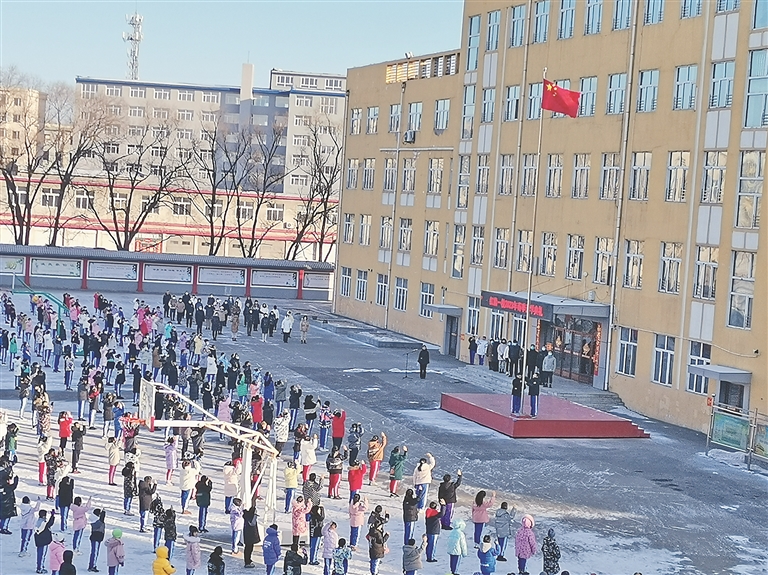 双鸭山市文化路小学学生敲起威风锣鼓。