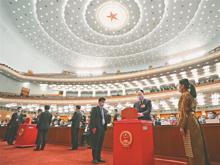3月10日,十四届全国人大一次会议在北京人民大会堂举行第三次全体会议。这是代表在投票。新华社记者 王毓国摄