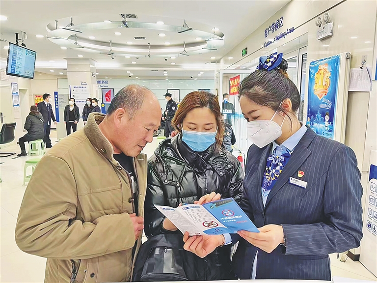 中国建设银行东方红支行的金融宣教活动正在如火如荼地开展。大堂内,吴军华正在讲解“杀猪盘”和虚拟货币诈骗等诸多新型金融骗局带来的危害,在学习的人群中有一位中年人手里拿着本子正在匆匆记录。“我是一名中学教师,现在不像以前了,学生们都有手机,也都喜欢上网,面对现在这些网络骗术难以招架,我在准备一次特别班会,让学生们小心一些,保护好自己。这次来听讲座是学习防诈知识,也想学一学怎么讲这些知识便于学生理解。”