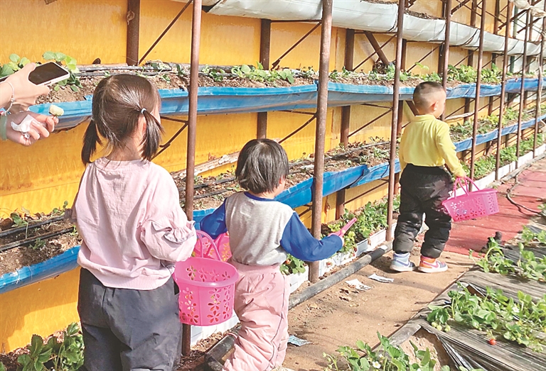 前来采摘的游客三五成群,小朋友一人一个采摘篮,列队开启“采摘”之旅。一时间棚室内欢声笑语,好不热闹。