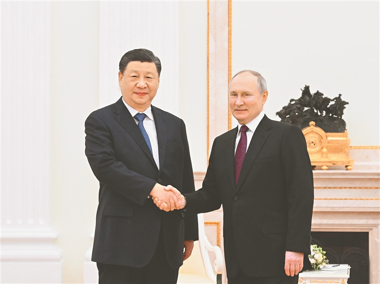 普京热烈欢迎习近平对俄罗斯进行国事访问,对习近平连任中国国家主席再次表示热烈祝贺。普京表示,过去十年来,中国各方面发展都取得令世人瞩目的伟大成就,这归功于习近平主席的卓越领导,也证明了中国国家制度和治理体系的优越。我坚信,在习近平主席坚强领导下,中国必将继续发展繁荣,顺利实现各项既定宏伟目标。在双方共同努力下,近年来俄中关系在各领域都取得了丰硕成果。俄方愿同中方继续深化双边务实合作,加强在国际事务中的沟通协作,推动世界多极化和国际关系民主化进程。