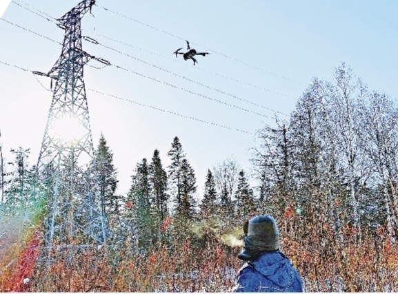 图为伊春供电公司输电运检人员利用无人机对输电线路进行巡查。